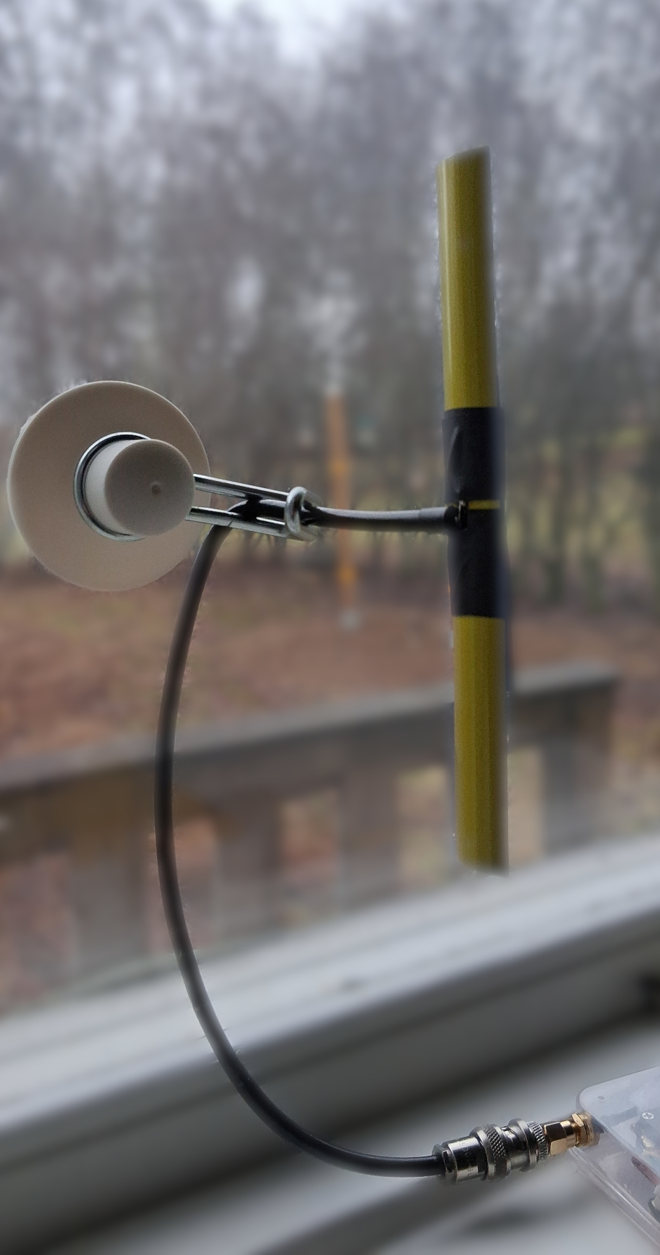 Homemade half-wave dipole built from measuring tape, with two 8.6 cm legs (quarter-wave each) fed at the center.